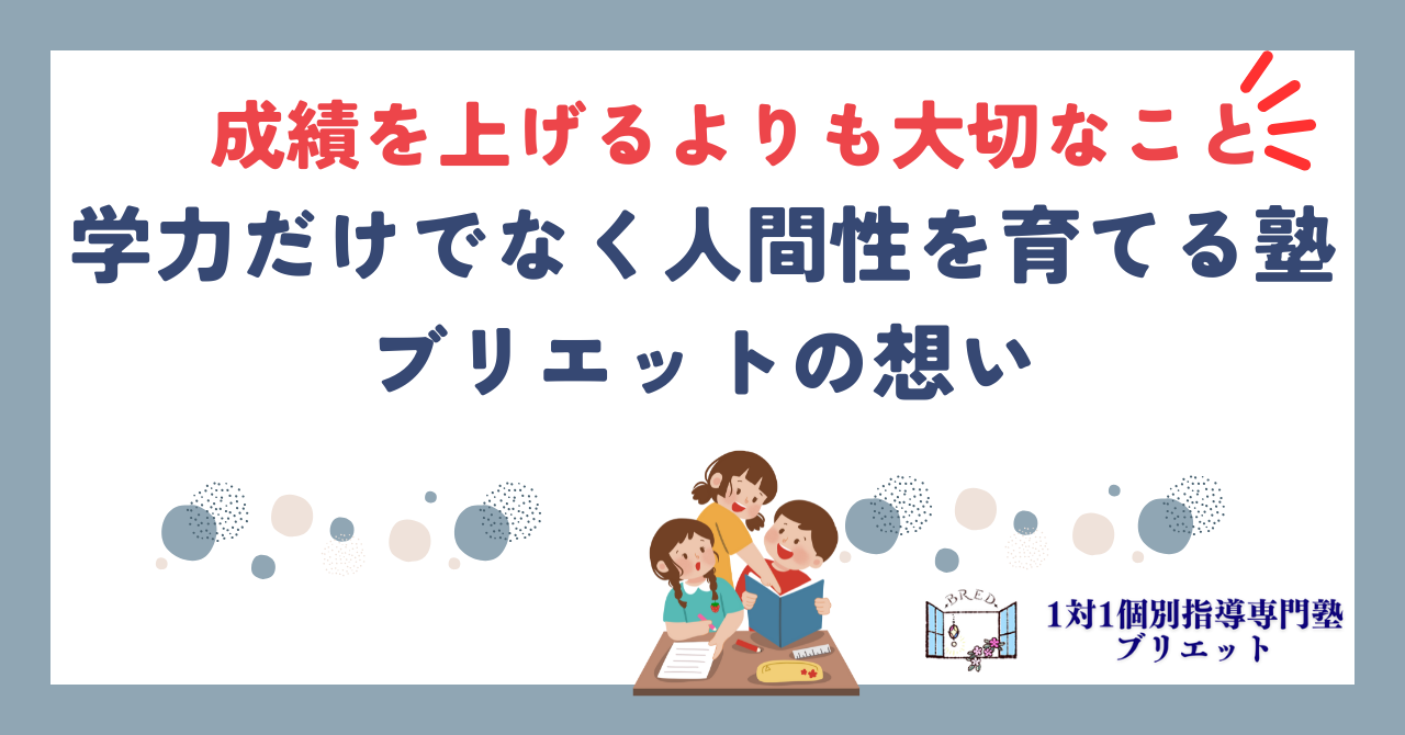 1対1指導塾ブリエットは、学習塾ではありますが、成績を上げるだけの塾ではダメだと思っています。成績を上げるような人間性を育て、成績を上げた一歩先に「自分は到達できる」という志の高さを保障する自己肯定感を高められる塾を目指しています。