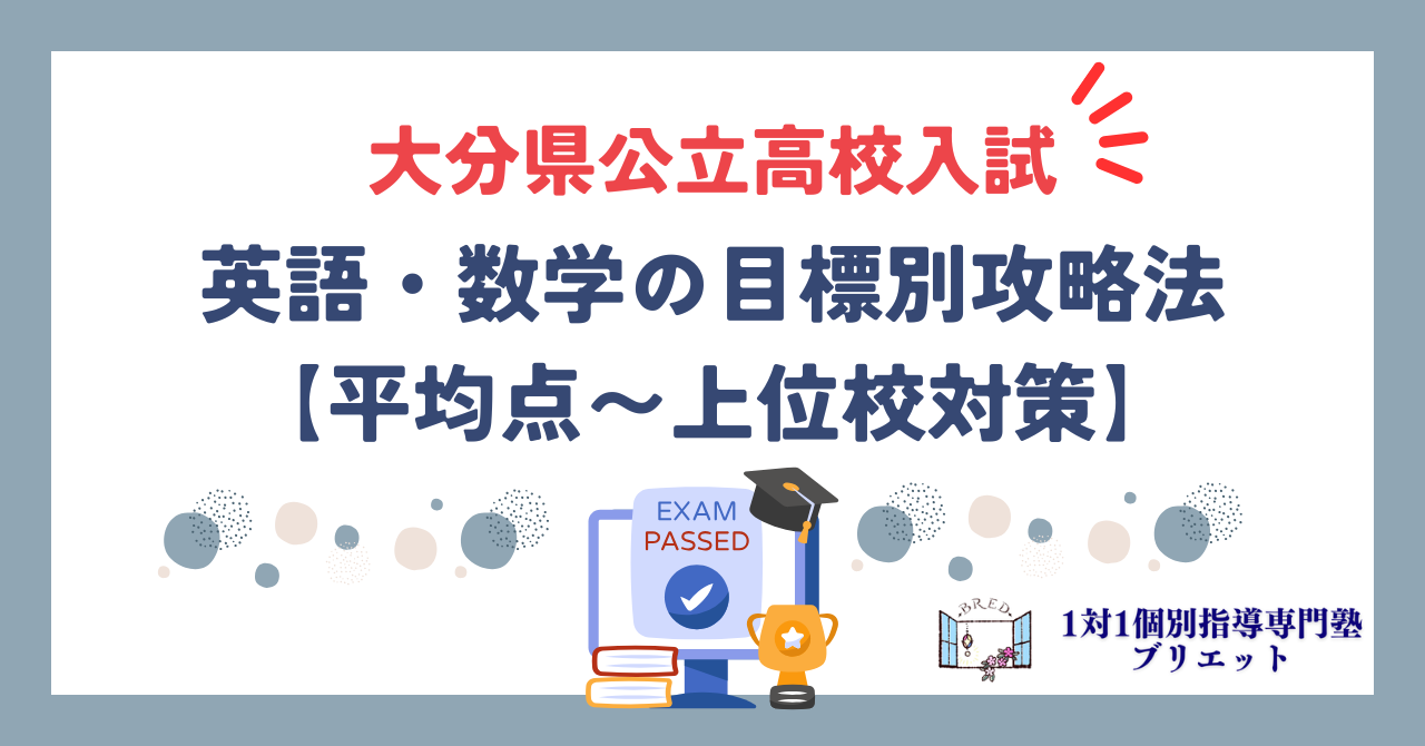以上が、大分県公立入試の英語と数学における目標別の攻略法です。目標の持ち方やそれに合わせた戦略が大事になります。勉強では、闇雲にやっても上がりません。具体的に入試問題のどこを取って、そのために力を入れるべきなのかを、この記事を参考に明確にして、これからの勉強に生かして欲しいです。