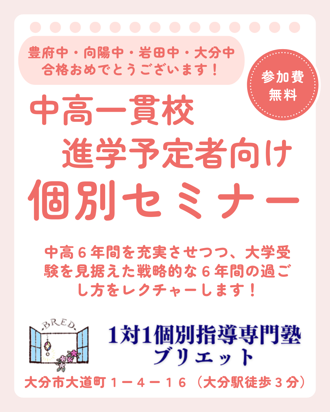 - 対象:向陽中・岩田中・大分中・豊府中など中高一貫校進学予定者と保護者